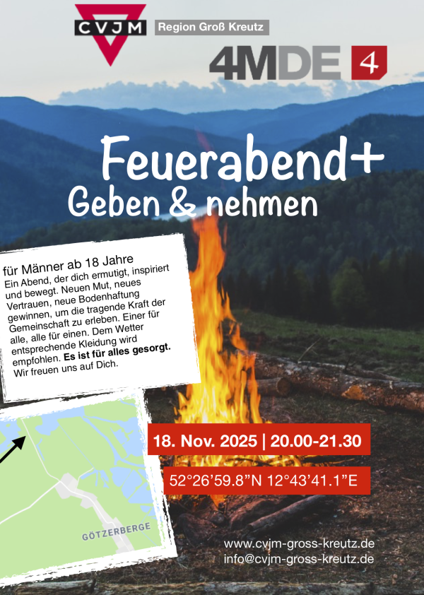 Ein Feuerabend ist ein echtes „Männerding“. Ein Abend, der dich ermutigt, inspiriert und bewegt. Neuen Mut, neues Vertrauen, neue Bodenhaftung gewinnen, um die tragende Kraft der Gemeinschaft zu erleben. Einer für alle, alle für einen.